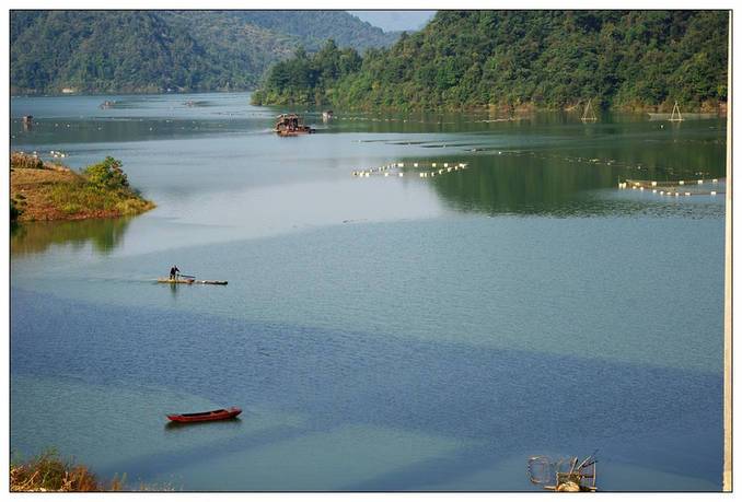 不知過(guò)了多久!也不知穿過(guò)了多少座隧道!我依然沉浸在遠(yuǎn)離凡塵喧囂的鬧市、相伴于群山峻嶺,四季如春綠油油松柏夾雜著少許紅楓秋葉的幻想之中,間或在轉(zhuǎn)瞬即逝日薄西山的余暉照映下熠熠生輝!此時(shí)此刻的我已經(jīng)是到了忘我的最高境界,腦中忽然閃過(guò)歐陽(yáng)老翁的一句至理名言——【醉翁之意不在酒,而在乎山水之間!】這句話用在此處真的是妙不可言!我那萬(wàn)千思緒隨著飛馳的車輪早已飄到九霄云外,暗自為窗外如畫如詩(shī)的景象所迷惑、所陶醉、所依戀...!猛然間聽(tīng)到一句非常熟悉且溫暖的話——爸爸!快看!到了磨子潭風(fēng)景觀賞區(qū)了!我才恍然如夢(mèng)驚醒,朝遠(yuǎn)處向下望去好一個(gè)一望無(wú)際的“磨子潭”!其潭水清澈,魚影可現(xiàn);微風(fēng)襲來(lái),碧波蕩漾;譚中游筏,漁歌互答;這時(shí)女兒也詩(shī)意助興了!滿懷深情地吟誦——“磨子潭水-深千尺,不及‘爸媽’-送我情!”這句真是太絕了!女兒漸漸地長(zhǎng)大了,懂得感恩戴德了。車子終于快要鉆進(jìn)最后一個(gè)隧道了,我也不知道它是排第幾?感覺(jué)今天好像是專乘“高速隧道”之旅了?!在快要進(jìn)入末了隧道的一霎那,我還特留戀地回頭朝窗外俯視一下,只見(jiàn)磨子潭中那無(wú)數(shù)的‘網(wǎng)箱’把整個(gè)潭水劃分成大小不等的方塊,好像一張碩大無(wú)比殘缺不全的圍棋盤面撒在幽深的譚中,我還來(lái)不及細(xì)數(shù)就立刻消失在我難以忘卻的視線中.....!