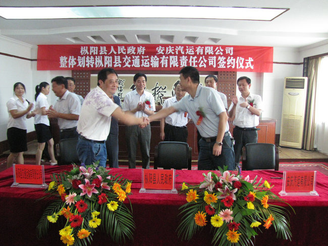 2011年9月1日,樅陽縣人民政府、安徽省交通集團(tuán)安慶汽運(yùn)有限公司整體劃轉(zhuǎn)樅陽縣交通運(yùn)輸有限責(zé)任公司簽約儀式在樅陽迎賓館會議大廳內(nèi)隆重舉行。樅陽縣縣長何謙、副縣長胡海峰,省交通集團(tuán)汽車運(yùn)輸有限公司副總經(jīng)理方詩喬,安慶汽運(yùn)有限公司董事長張進(jìn)、黨委書記徐軍、副總經(jīng)理王中明、彭宏、紀(jì)委書記郭峰,樅陽縣交通運(yùn)輸有限責(zé)任公司經(jīng)理童子健出席了簽約儀式。